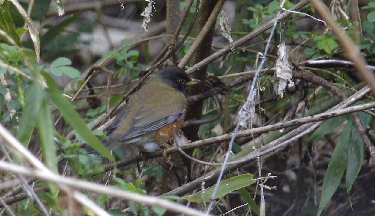 アカハラ スズメ目ツグミ科 分布夏季に千島列島で繁殖し、冬季になると日本へ南下し越冬する。 形態全長23.5-24cm。胸部から腹部側面にかけてオレンジ色の羽毛で覆われ、和名の由来になっている。腹部中央部から尾羽基部の下面(下尾筒)にかけて白い羽毛で覆われる。頭部は暗褐色の羽毛で覆われ、顔や喉は黒ずむ。 上嘴の色彩は黒く、下嘴の色彩は黄色みを帯びたオレンジ色。後肢の色彩は黄色みを帯びたオレンジ色。メスは喉が白い個体が多い。 生態平地から山地にかけての森林に生息する。 食性は動物食傾向の強い雑食で、主に昆虫類を食べるが果実も食べる。 繁殖形態は卵生。山地の森林(北海道や東北地方では平地でも)に巣を作り卵を産む。 |