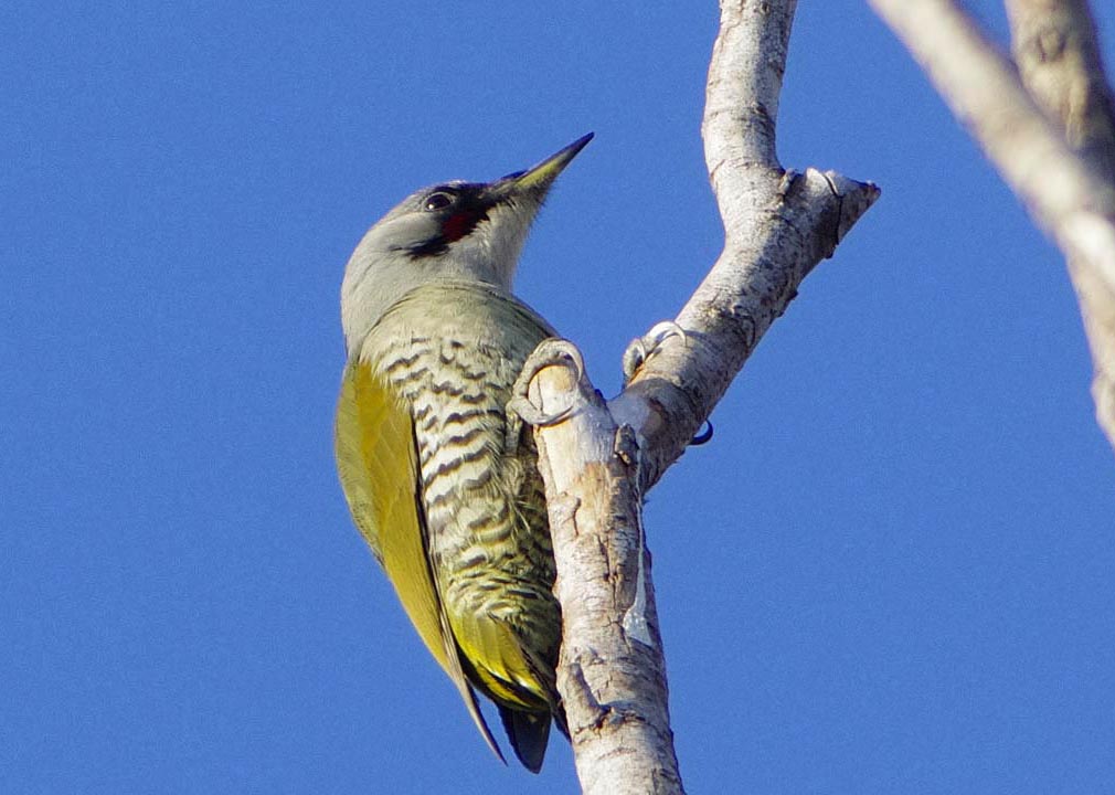 形態全長29cm (29-30cm)、体重120-138g。体上面の羽衣、尾羽や翼は黄緑色で、和名(緑も含めた古い意味での青)の由来になっている。背中や肩羽は灰色みを、腰や尾羽は黄色みを帯びる。胸部の羽衣は灰褐色。腹部の羽衣や尾羽基部の下面(下尾筒)は白く、体側面から下尾筒にかけてアルファベットの「V」字状の黒い斑紋が入る。頭部や頸部の羽衣は灰色で、嘴の基部から側頭部にかけて黒い筋模様(顎線)が入る。顎線の一部は赤く、喉は白い。初列風切は黒褐色で、白い斑点が入る。 虹彩は暗赤色。上嘴の色彩は黒く、下嘴の色彩は黄色みを帯びる。後肢の色彩は灰色。 オスは額から後頭にかけての羽衣が赤く、顎線にある赤色部の面積がより大きい。メスは後頭の羽衣のみ赤く、顎線にある赤色部の面積がより小さい。 南に分布する個体群は小型で、体色が濃くなる傾向がある。