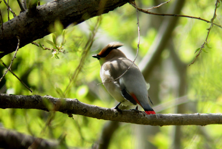 ヒレンジャク分布ヒレンジャクはシベリア東部・中国北東部のアムール川・ウスリー川流域で繁殖するが、森林の減少と環境悪化によって絶滅が危惧されている。 越冬地は日本のほか、サハリン、朝鮮半島、中国南部、台湾などだが、年によって飛来数が極めて不規則であり、まったく観察されない年があったり、越冬地でも一年を通してみられることもある。日本では沖縄県中部より北の地域に、11月から5月にかけて滞在する。東日本に多いキレンジャクに対して、ヒレンジャクは西日本に多く渡来し、北海道ではほとんど見られない。越冬地は低地や、丘陵地の開けた森林・農地などであり、公園や家の庭などにも餌となる果実を求めて飛来する。 形態 体長は約18cm、翼開長は約29cm。オスとメスはほぼ同色で、全体的に赤紫がかった淡褐色であるが、頭や羽などに特徴的な部位が多い。顔はやや赤褐色みを帯び、尖った冠羽、冠羽の縁まで至る黒い過眼線、黒いのど(メスは、黒斑の下端の境界が曖昧である)などである。 初列風切は黒褐色で、外弁は灰色、オスは白斑があるが、メスは外弁にのみ白斑がある。次列風切に灰色で先の方は黒色、先端部は赤い。レンジャク族の英名「ワックスウィング」(Waxwing) の由来である、キレンジャクやヒメレンジャクに見られる次列風切の先端にある赤い蝋状の突起物は、ヒレンジャクにはない。大雨覆の先端は暗赤色。 腹は黄色みを帯びており(キレンジャクとは異なる)、腰から上尾筒は灰色、下尾筒は赤(キレンジャクは橙褐色)、尾は灰黒色で先端が赤色である。尾羽の枚数は12枚であり、漢名「十二紅」の由来となっている。 生態日本などに飛来する冬の非繁殖期には主に果実類、ネズミモチ、イボタノキ、ニシキギ、ヤドリギ、ノイバラ、ヤツデなどを食するが、繁殖期である夏の間は昆虫食である。ヒレンジャクは基本的に数羽から数十羽の群れで行動するが、稀に100羽以上の大群となることもある。また、しばしばキレンジャクとの混群もみられる。鳴き声は甲高く「ヒーヒー」「チリチリ」などと鳴くが、囀りはない。巣は、樹上に小枝を用いたお椀状のものを作り、その中には草や苔などを敷く。卵の数は5〜6個。 |