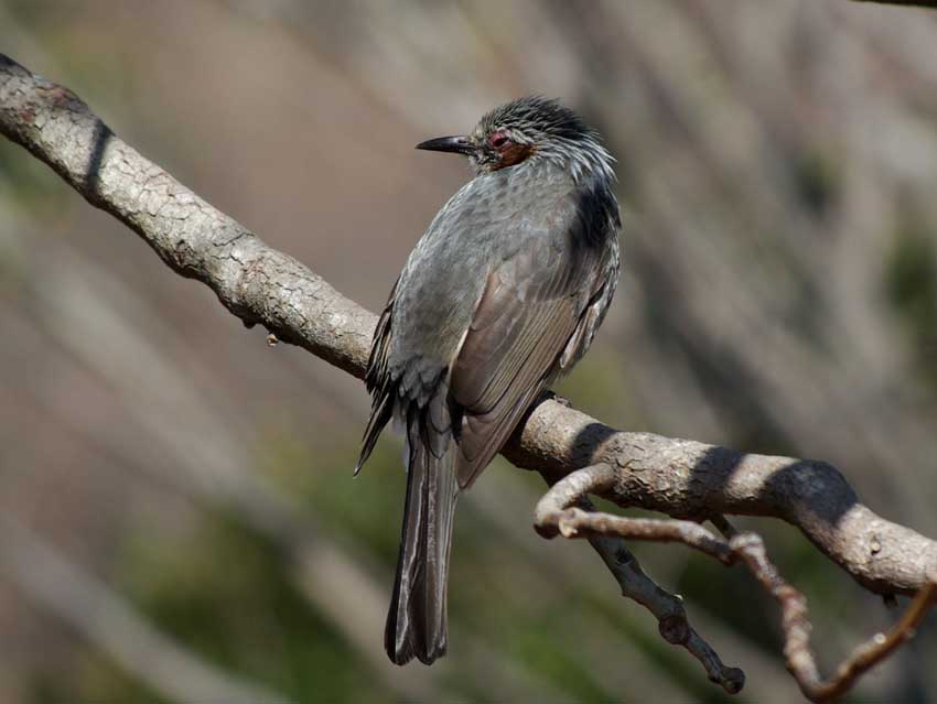 分布中国南部、台湾、日本 形態体長は27.5cm。頭部から胴体は灰色の羽毛に覆われるが、頬に褐色の部分があり、よく目立つ。また、頭頂部の羽毛は周囲よりやや長く、冠羽となっている。翼や尾羽は灰褐色をしている。