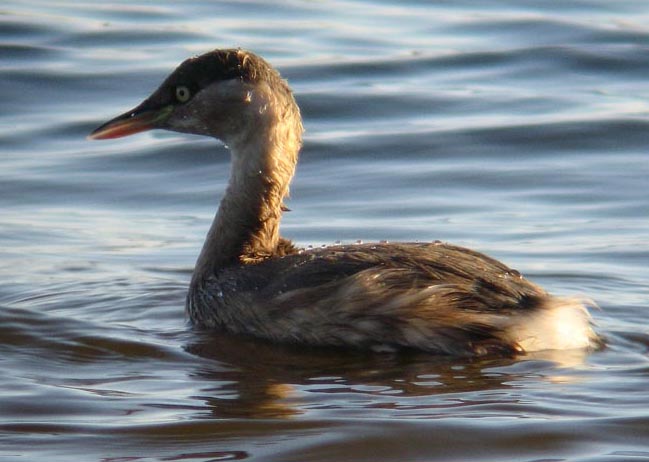 カイツブリ カイツブリ科 形態全長は25pほどで、ヒヨドリと同じくらいの大きさ。目は黄白色で真円に近く、小さく黒い瞳を持つ。夏羽はくちばしを含む大部分が黒褐色で、頭下部から首のつけねにかけて赤褐色となる。冬羽は大部分が薄茶色で、翼部と頭上部が焦茶色、くちばしは黄色となる。また季節にかかわらず、くちばしのつけねから目の前方まで黄白色の線が入る。 生態 日本では公園の池などを含む多くの川・湖・沼等に生息していて、古くから「にお」と呼ばれている。多くの地域で1年中みられる「留鳥」だが、寒い地方で繁殖する個体は冬には温暖な地域へ移動する「漂鳥」である。 春から夏にかけて、ヨシや水草の陰にそれらの葉を使って浮き巣をつくり、産卵する。ヒナは小さいうちは親鳥の背中に乗っていることが多い。 潜水が得意で、15-25秒程度も潜行することができ、観察していると潜った地点よりかなり離れたところに浮上することが多い。最高で1-2メートル潜ることができ、小魚・水生昆虫・エビなどを捕食する。また、危険を感じたときにも潜水する。足には水かきはなく、弁足と呼ばれるヒダがある。 |