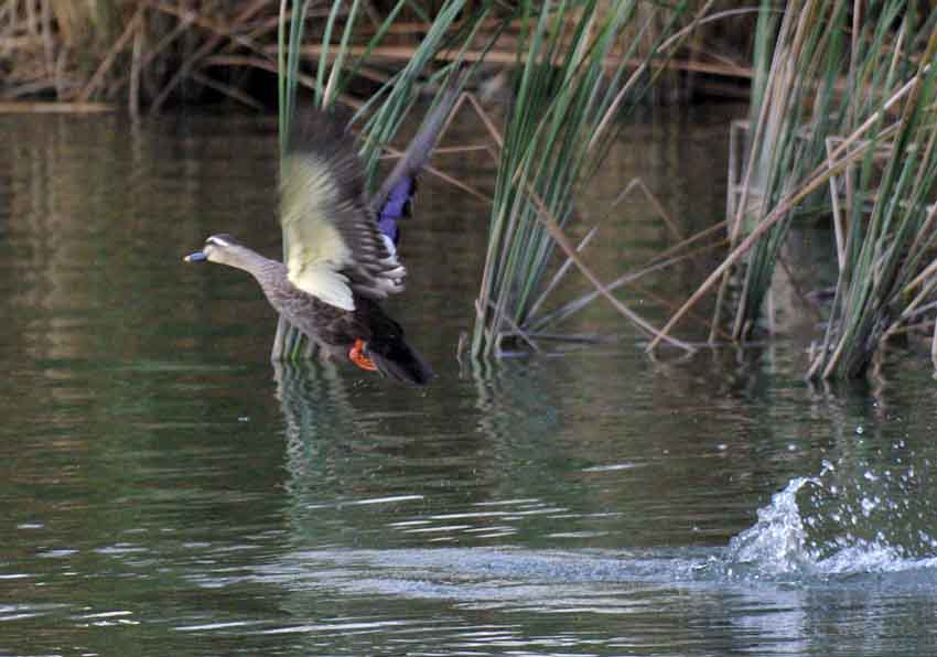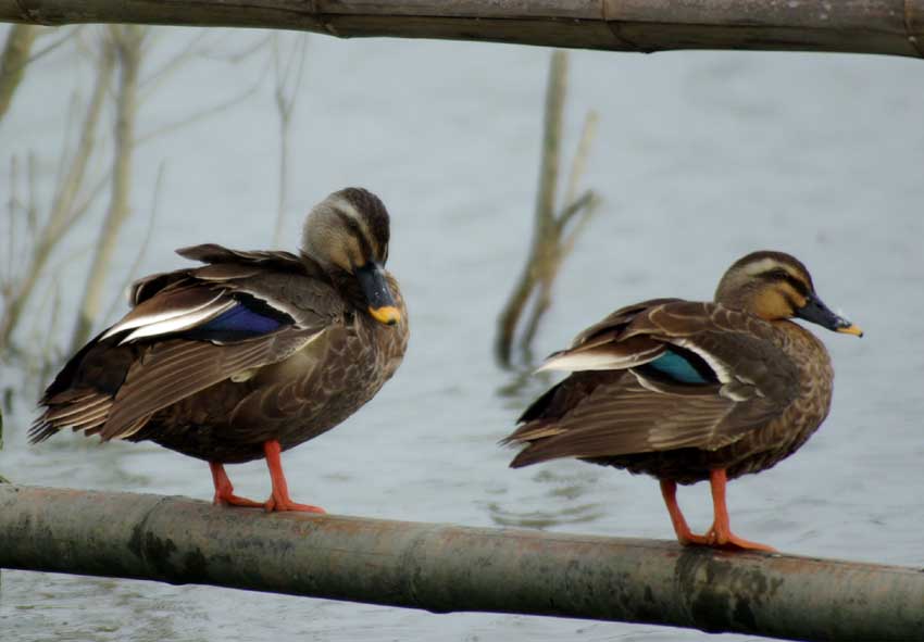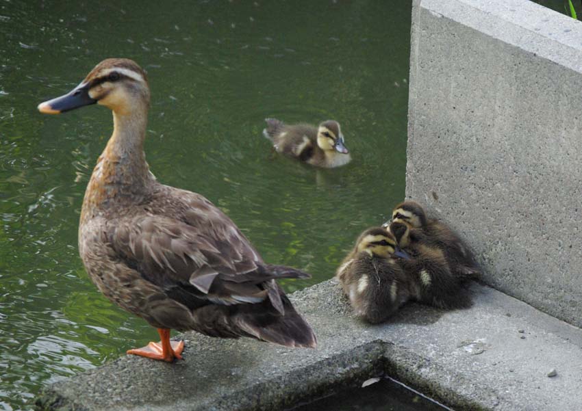 カルガモ カモ科 分布本州以南では、平野部から山地にかけての水辺に広く分布する留鳥だが、北海道では夏鳥(一部冬季も残留するものもいる)である。市街地でも普通に観察される。 形態体長は 60cm 前後であり、日本産のカモ類の中では大きい。また全身が茶褐色で、黒と茶の鱗状、尾に近づくほど濃い茶色になる。一見雌雄同色同柄であるが、山階鳥類研究所によれば、雄は下尾筒上部(尾羽の下)が黒く、雌では黒い羽毛に白斑が混ざり薄く見えることで判別できる。 生態水面採食で、食性は植物食。主に水中の藻などを食べるが、水際に生えたイネ科植物などの実を食べることもある。 ほとんどのカモ類と同様、一夫一妻で毎年つがいを形成する。日本国内では晩春から初夏にかけて繁殖する。抱卵・育雛はメスのみが行う。メスは草地の地上に皿状の巣を作り、平均サイズ45×33mmの白色の卵を10〜14個産卵する。卵は抱卵開始から26〜28日で孵化し、40〜60日ほどで飛行可能になる。 繁殖期前はつがいで行動するが、メスが抱卵・育雛を行っている間、オスはオスだけの群れを形成して生活する。繁殖期が終わり、メスと子のつながりが消失する10月ごろにはオスだけの群れもいったん解消され、その後オスメス合わさった大群を形成して越冬する。