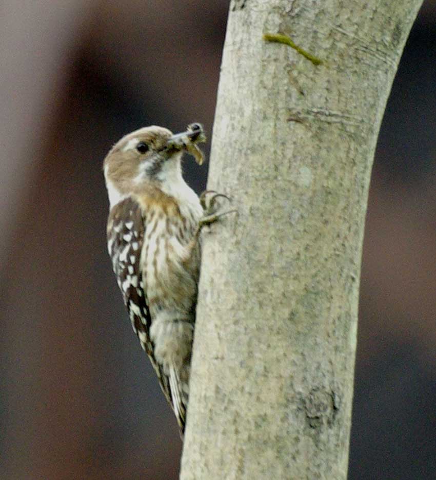 分布全国の亜寒(亜高山)帯針葉樹林から亜熱帯照葉樹林まで、天然林から雑木林や都市公園などまで、木立のある場所に広く見られる。 留鳥だが、冬季には暖地へ移動するものもいる。近年、市街地に近い樹林や都市公園などにも定着している。 特徴全長15cmほどで、スズメと同じくらいの大きさ。日本に生息するキツツキとしては最も小型である。雌のほうがやや大きい。灰褐色と白のまだら模様の羽色をしている。南方に分布するものほど体色が濃くなる傾向がある。 生態