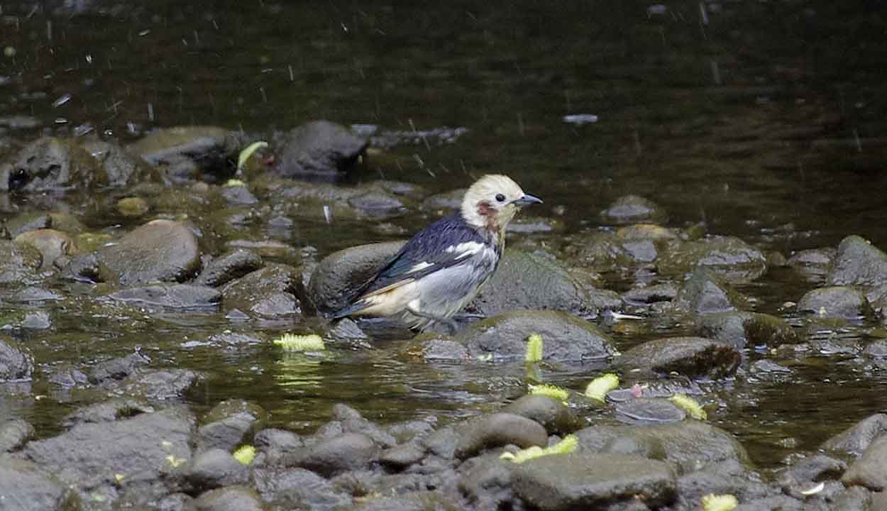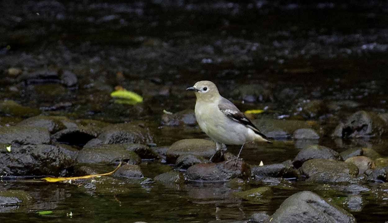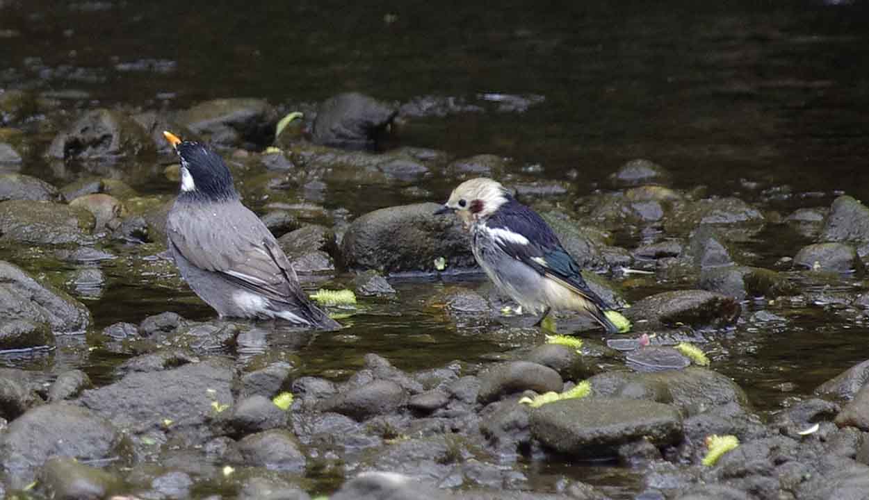 コムクドリ スズメ目ムクドリ科 分布千島列島、サハリン南部、日本で繁殖し、冬季はフィリピン、ボルネオ島北部等に渡り越冬する。 日本では夏鳥として北海道、本州北部で繁殖するが、渡りの時期は本州中部以南の地域でも見られる。 形態体長約19cm。雄は頭部から喉にかけてが淡いクリーム色で、頬から耳羽後方にかけて目立つ茶色の斑がある。背中や肩羽、翼は黒色で、体の下部はややくすんだ感じの淡いクリーム色である。雌は、頭部から胸にかけてが灰褐色で、頬に茶色の斑はない。雌雄とも嘴と脚は黒色である。 生態平地から山地の明るく開けた林に生息する。人里近くでも生息する。 繁殖期にはつがいで生活するが、渡りの時は群れを作る。秋の渡りの方が群れは大きい。少数の群れの時は、ムクドリの群れに混じっていることがよくある。 食性は雑食性で、樹上で昆虫類やクモを捕食したり、木の実を採食する。 主に樹洞やキツツキ類の古巣に営巣するが、人家の屋根の隙間、石垣等に営巣したり、巣箱を利用したりもする。巣の中には枯葉や落ち葉を敷く。産卵期は5-7月で、卵数は4-6個、抱卵日数は8-11日、約14日で巣立ちを迎える。 地鳴きは「キュル キュル」、「ギュル ギュル」など。さえずりは「チ チ チ ピーキュル ジョイジョイジョイ」など明るい声と濁った声を混ぜながら早口で鳴く。 |