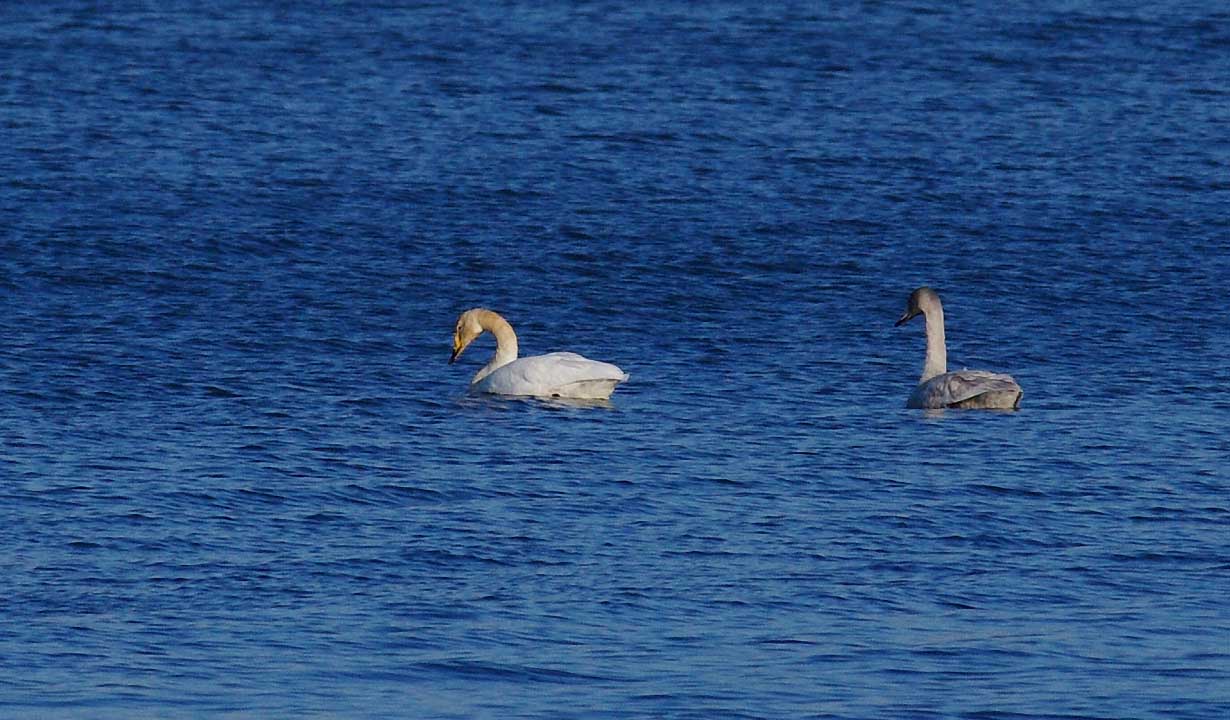 オオハクチョウ カモ科ハクチョウ属 分布日本では冬季に主に日本海側の本州以北に飛来する。日本国内の越冬地としては根室、風蓮湖(北海道)、大湊、小湊(青森県)、八郎潟(秋田県)、瓢湖(新潟県)、牛久沼(茨城県)、宍道湖(島根県)などがある。 形態全長140-165センチメートル。翼開張218-243センチメートル。全身の羽衣が白いが、個体によっては鉄分の多い湖沼で水中の水草などを採食する際に頭部や首が錆色や黄褐色を帯びることがある。 虹彩は褐色。嘴は黒く、上嘴基部は黄色で黄色部が鼻孔下部に突出し尖ったような形状になる。鼻孔は嘴の中央よりもやや前方に開口する。気管が長い紐状で胸骨内で上方に向かう。後肢は黒い。 雛の綿羽は淡灰白色。幼鳥の羽衣は灰褐色で、嘴基部が淡ピンク色。 生態4-7個の卵を産む。抱卵期間は36-40日。雛は孵化してから2か月で飛翔できるようになる。 体重は10kgを越え、空を飛ぶ生物としては限界の重さである。そのため、離陸時は助走を必要とする。鳴き声は大きく、「コォー」と鳴く。 シベリアやオホーツク海沿岸で繁殖し、日本には越冬のため千島列島を経由し渡来する。 食性は草食性が強く、水中や水面の水草を採餌したり、陸上で落ち穂や青草を食べる。 近年、日本各地でよく人によって餌が与えられるようになったため、渡来数が増えている。 日本で越冬する個体が増え続けている。同じ現象がコハクチョウの他、ナベヅルやマナヅル等々でも生じている。これらは日本において極端な(人工的)給餌を行い、一方それ以外の越冬する国では、そのようなことが行われていない結果である。 |